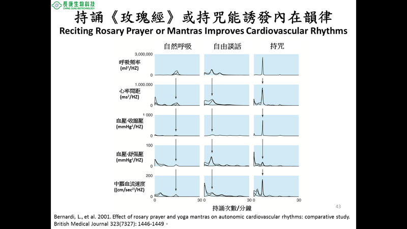 我常常在演講時和大家分享靜坐時呼吸自然降到每分鐘六次的相關科學發現,尤其是義大利心臟科醫師陸芝亞諾.波納迪 (Luciano Bernardi) 和他的研究團隊於2001年在《英國醫學雜誌》所發表的研究。他們發現,持誦天主教玫瑰經或東方心咒,能將呼吸在內的所有重要身體節律,穩定的降到每分鐘六次左右。這一梅爾頻率所代表的共振態,或說諧振態,也就是與血液循環和呼吸系統相關的生理功能最佳的放鬆自在狀態,基本上可說是囊括了所有的身體機能。
