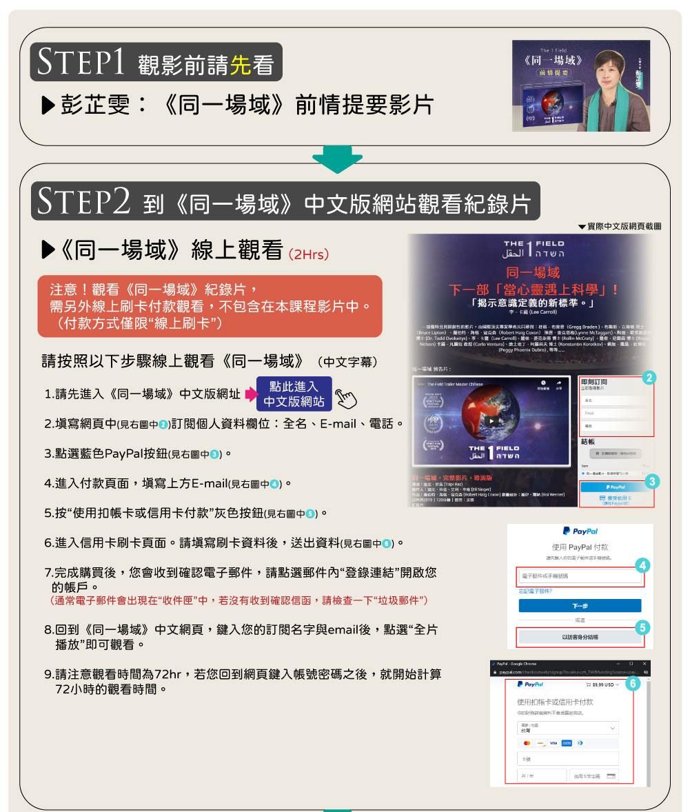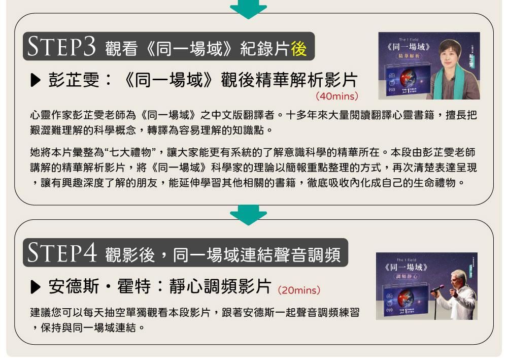 - 《同一場域》電影中包含了大量的科學實驗成果,資訊量龐大,建議您按照以下步驟觀看,更能完整學習感受到片中的精華內涵。
