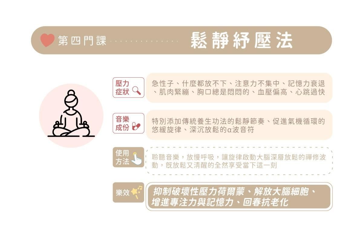 這門課程完美的融入了現代Spa紓解壓力、放鬆身心的按摩律動,能自動調節自主神經系統,使大腦產生深層放鬆的α波,逐漸進入深度睡眠。這些在錄音製作過程,讓工作人員工作到一半就睡著的樂曲,將可以讓你安睡在無壓力的音樂軟床上,享受五星級的睡眠品質。